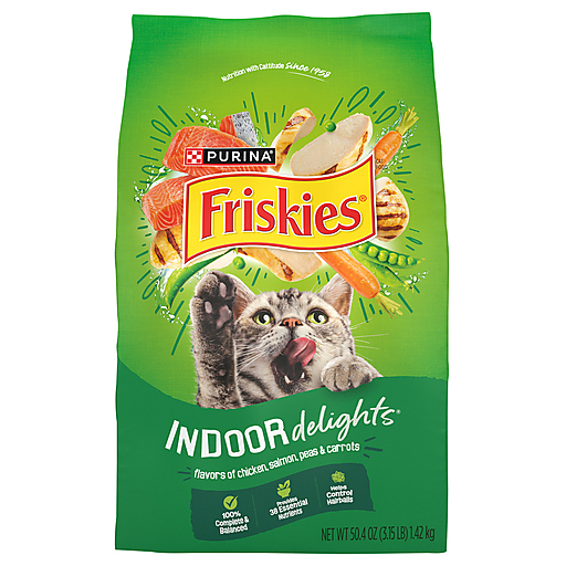 Help your cats maintain their purrfect physique with Purina Friskies Dry Cat Food Indoor Delights Flavors of Chicken, Salmon, Peas, and Carrots. This a-MEOW-zing formula provides 100 percent complete and balanced nutrition for adult cats, promoting healthy weight and helping control hairballs for your indoor cats. This cat kibble specifically provides essential fatty acids for skin and coat health, vitamin A and taurine for vision support, and antioxidants for cats’ immune support. If you are still looking to give your indoor cats something more to explore, this Friskies cat food features cat-tastic shapes to capture their attention and imagination. Make this delicious indoor cat food part of your cats’ mealtime, feed their taste for adventure, and they will meow for more. Purina Friskies Dry Cat Food Indoor Delights Flavors of Chicken, Salmon, Peas, and Carrots has it all.