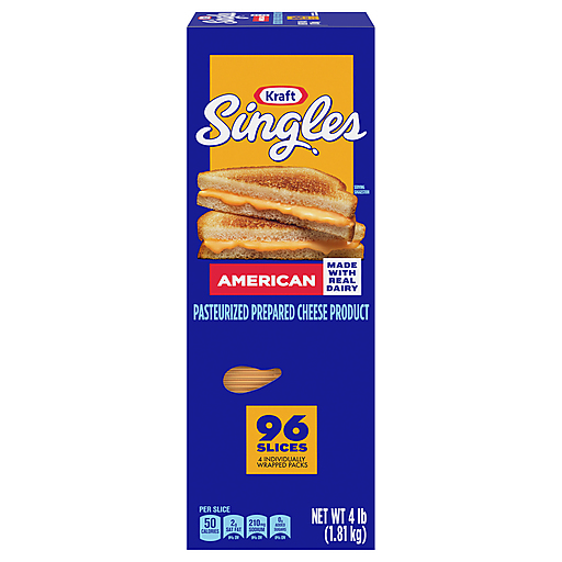 Delicious any way you square it, Kraft Singles American Slices deliver the classic American taste and irresistible melt that take your favorite foods to the next level. Made with real dairy and no artificial flavors, our slices have a mild, savory flavor and smooth, creamy texture that’s perfectly melty. Our simple squares are ideal for more than just grilled cheese. Try adding Kraft Singles to your breakfast sandwich, burger or tuna melt. Transform steak and bread into a Philly cheesesteak, put a twist on ramen or turn plain fries into ooey gooey cheese fries. When you’re craving classic comfort food, add America's favorite square to your mac and cheese for a simple joy that’s sure to make you smile. Each cheese slice comes individually wrapped for convenience, so you can stack and snack any time. Kraft Singles contain 50 calories per serving. For optimal creamy goodness, keep our large box of 96 slices refrigerated.
