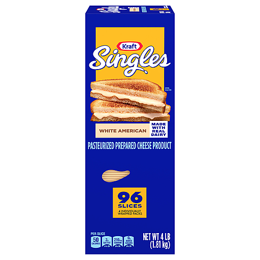 Delicious any way you square it, Kraft Singles White American Slices deliver the classic American taste and irresistible melt that take your favorite foods to the next level. Made with real dairy and no artificial flavors, our slices have an extra mild, savory flavor and smooth, creamy texture that’s perfectly melty. Our simple squares are ideal for more than just grilled cheese. Try adding Kraft Singles to your breakfast sandwich, burger or tuna melt. Transform steak and bread into a Philly cheesesteak, put a twist on ramen or turn plain fries into ooey gooey cheese fries. When you’re craving classic comfort food, add America's favorite square to your mac and cheese for a simple joy that’s sure to make you smile. Each cheese slice comes individually wrapped for convenience, so you can stack and snack any time. Kraft Singles contain 50 calories per serving. For optimal creamy goodness, keep our large box of 96 slices refrigerated.