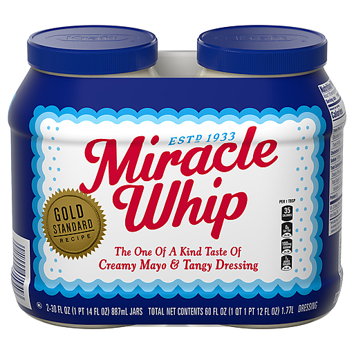 Enjoy the one of a kind taste collision of creamy mayo and tangy dressing. Miracle Whip Original Dressing delivers the ideal fusion of flavors with a bold, zesty taste that is unlike anything else you've ever had. With a tradition of tanginess dating back to the 1933 World’s Fair, Miracle Whip Dressing uses a unique blend of spices to provide a sweet, tangy and creamy flavor made for the perfect dressing. Our unique taste and trademark zip makes Miracle Whip the perfect choice to liven up your food. As a spread with a taste most similar to mayonnaise, Miracle Whip is known for bringing something extra to kick sandwiches up a notch – but we don’t stop there. Try our versatile ingredient in all of your favorite recipes. Use Miracle Whip to make flavorful salad dressings, savory entrees and even a decadent chocolate cake. You can add Miracle Whip to your coleslaw, tuna salad and potato salad recipe, or blend it in some honey and mustard to create a tangy dipping sauce for chicken. Miracle Whip contains fewer calories and fat than Kraft Mayonnaise. Our product contains 40 calories and 3.5 g fat per serving, while Kraft Mayonnaise contains 90 calories and 10 g fat per serving. Our Miracle Whip Mayo-Like Dressing, 2 count pack contains two 30 fl oz jars for easy use and storage. Each jar should be kept in the refrigerator after opening to maintain freshness.