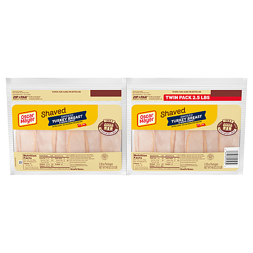 Keep your fridge stocked and skip the deli counter wait with Oscar Mayer Shaved Extra-Lean Smoked Turkey Breast & White Turkey Lunch Meat Twin Pack. With just 60 calories per serving, our deli shaved extra-lean smoked turkey makes a delicious addition to your favorite sandwich. Our smoked turkey deli meat conveniently comes fully cooked and ready to eat. Enjoy classic turkey flavor with an added hint of smokiness. Use slices of Oscar Mayer Shaved Smoked Turkey & White Turkey to make a flavorful deli sandwich or turkey wrap, or layer with bacon slices, lettuce and tomato to make a turkey club for lunch or dinner. Cut slices of smoked turkey into strips to top a salad, or use on top of cheese and crackers to add additional flavor and a bit of protein for a more exciting stack. Roll up slices of turkey with Kraft Singles for a quick snack, or start your day right with a turkey and cheese omelet. Whether it’s for lunch, dinner, a picnic or a snack, you’ll enjoy our quality Oscar Mayer turkey. Oscar Mayer Shaved Extra-Lean Smoked Turkey & White Turkey lunch meat comes in two 20 oz, resealable zip-packs to ensure freshness. If you enjoy our smoked deli turkey, be sure to try the other varieties of Oscar Mayer lunch meat. There’s something for the whole family with Oscar Mayer lunch meat.