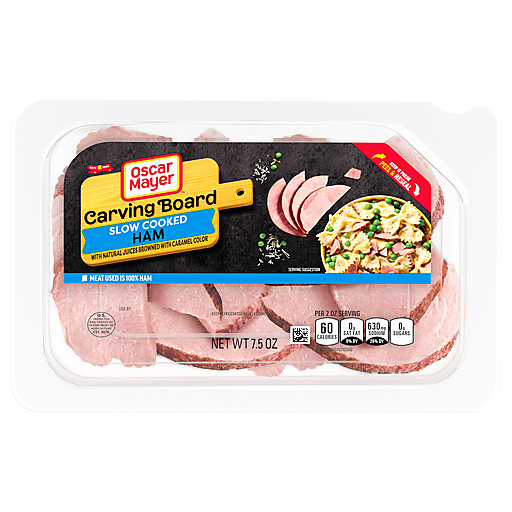 Enjoy thick, flavorful slices of ham without the need to get out your own knife and carving board. Oscar Mayer Carving Board Slow Cooked Ham With Natural Juices, Browned With Caramel Color, Lunch Meat is made with quality ham and contains no saturated fat. Our carving board ham lunch meat has a rich, classic ham flavor. Fully cooked and ready to eat, our ham slices are the perfect choice for sandwiches, salads, recipes and more. Use Oscar Mayer Carving Board deli meat to make a classic ham and cheese sandwich or ham salad sandwich, or add ham slices to salads or eggs. Keep each 7.5-ounce package of deli ham refrigerated to maintain freshness. If you enjoy our slow cooked deli ham, be sure to try the other varieties of Oscar Mayer lunch meat.